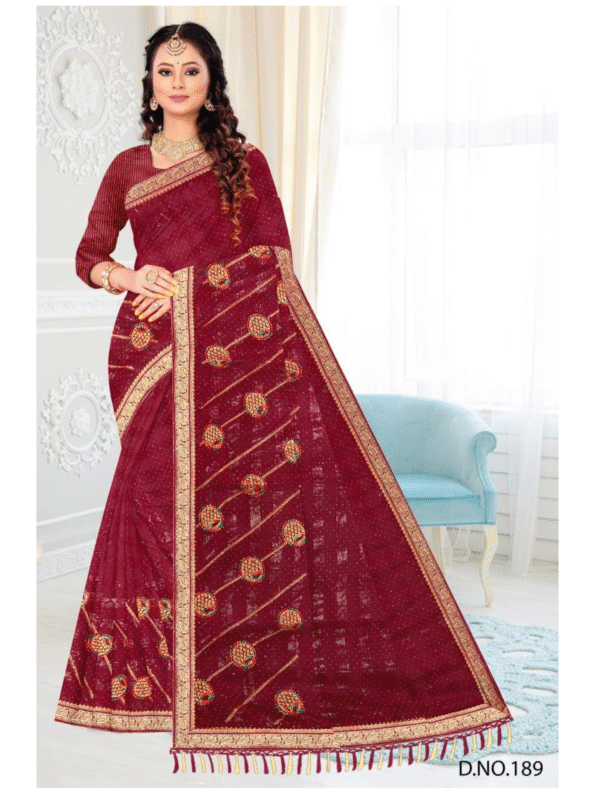 Maroon embroidered saree featuring golden zari border and tassel pallu — ideal for festive and wedding occasions.