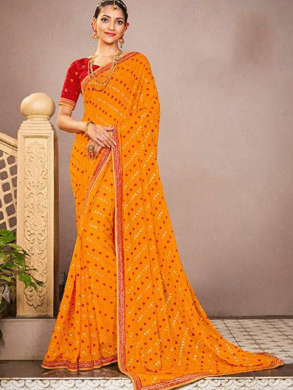 Step into timeless elegance with this mustard yellow Rajasthani Bandhej saree featuring traditional diagonal tie-dye patterns, a red embroidered blouse, and classic Gota Patti border work.