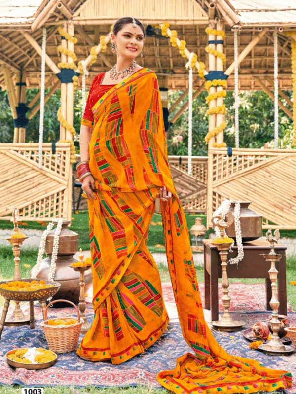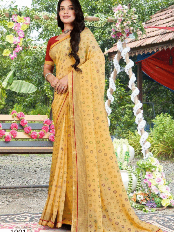 Mustard Yellow Printed Georgette Saree with Multicolor Stripes & Red Blouse