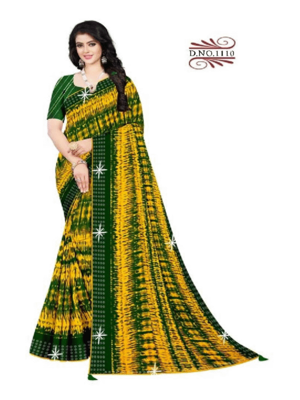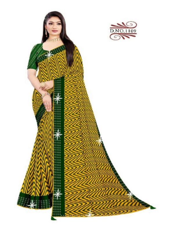 Bright mustard yellow saree with striking green border and zigzag print. Made from soft fabric for daily wear, office use, or festive occasions. Includes matching blouse piece.