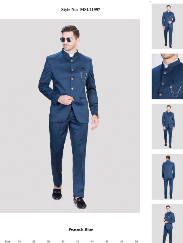 Premium peacock blue Indo-Western suit with mandarin collar & slim-fit trousers. Perfect attire for weddings, receptions & festive occasions.
