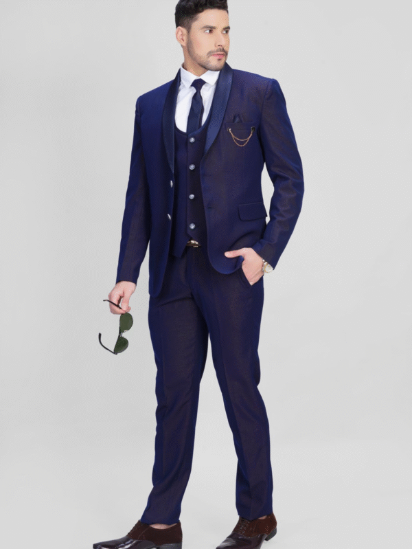 Regal Blue three-piece men’s suit with satin shawl lapel, tailored fit blazer, waistcoat, and slim-fit trousers. Ideal for weddings, receptions, and formal events.
