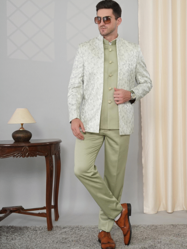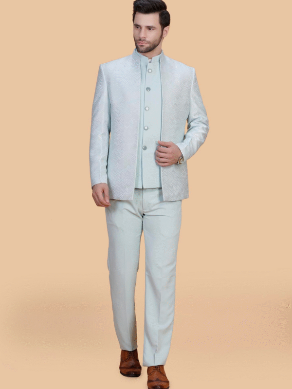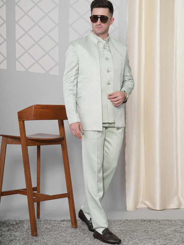 Mint Green Textured Indo-Western Suit with Mandarin Collar – Wedding & Reception Wear