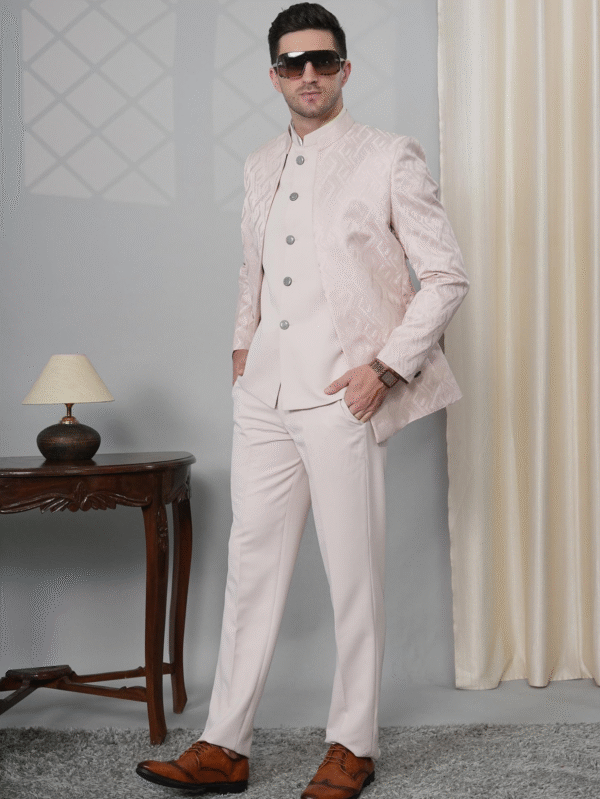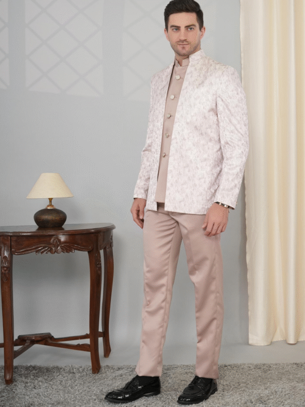 Pastel Pink Imported Indo-Western Suit with textured jacket, kurta & trousers – perfect for weddings, receptions, and festive occasions.