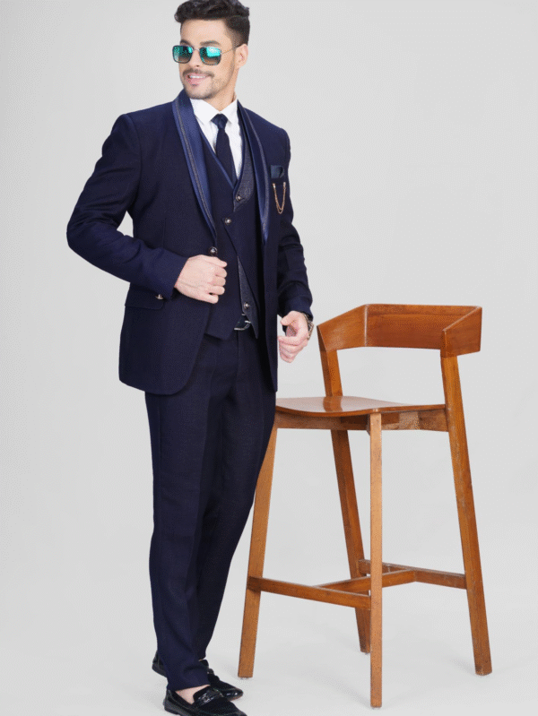 Navy Blue Imported Three-Piece Suit with Satin Detailing – SNA-MSU12954