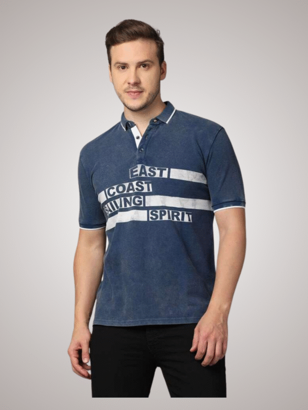 Trendy navy blue polo T-shirt with bold “East Coast Sailing Spirit” chest print, crafted from soft cotton blend fabric. Perfect for casual and weekend wear.