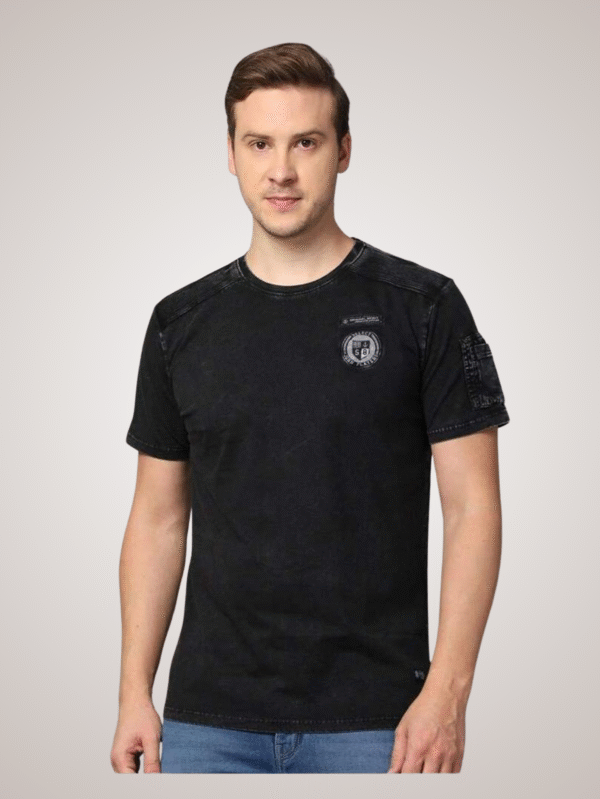 Stylish black washed T-shirt with crew neck and subtle chest badge design. Crafted from soft cotton blend for everyday comfort and casual wear.