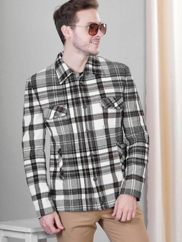 Stylish men’s plaid button-up jacket in black & white checks with a classic fit – perfect for casual & smart looks.