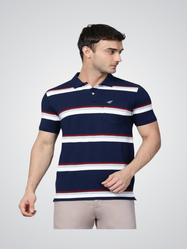 Classic navy blue polo T-shirt with bold white and red horizontal stripes. Made from blended fabric for comfort, durability, and style.