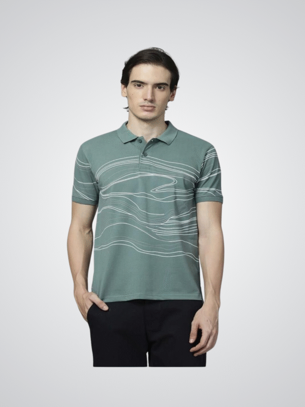 Stylish green polo T-shirt with modern white wave print. Made from premium blended fabric for comfort, durability, and contemporary appeal.