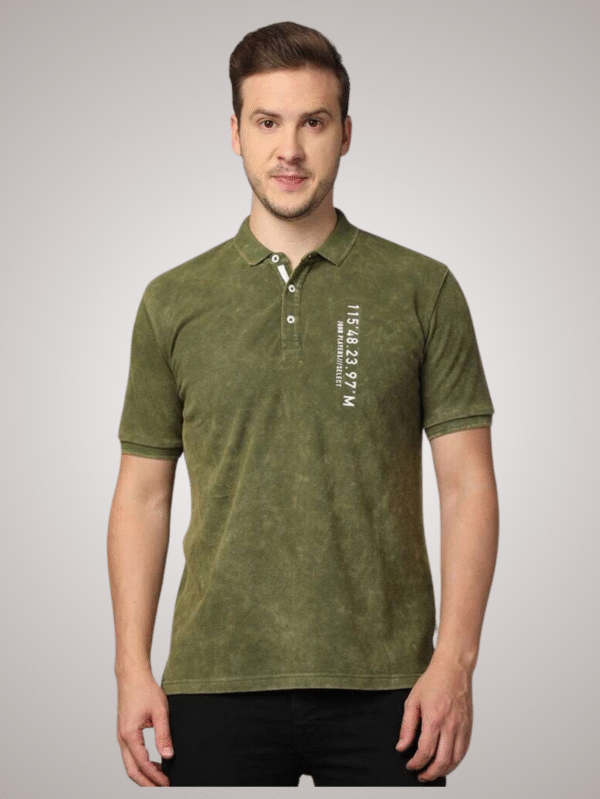 Trendy olive green washed polo T-shirt with chest print. Made from soft cotton blend fabric, perfect for casual and semi-casual occasions.