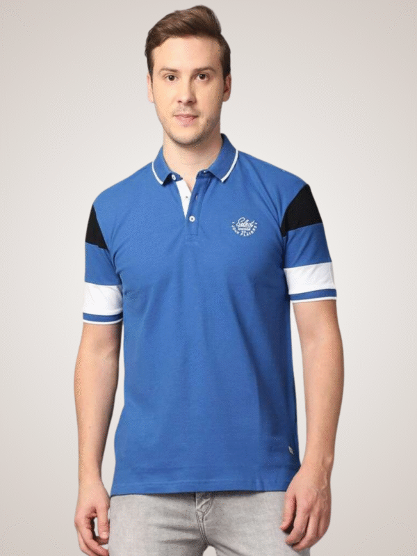 Stylish royal blue polo T-shirt with black and white colorblock sleeves and contrast collar detailing. Perfect for casual and smart-casual looks.
