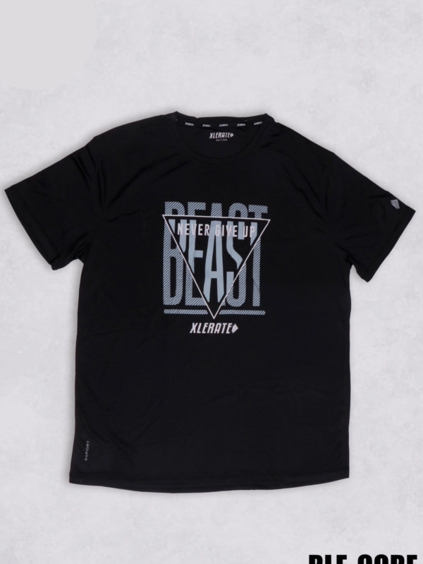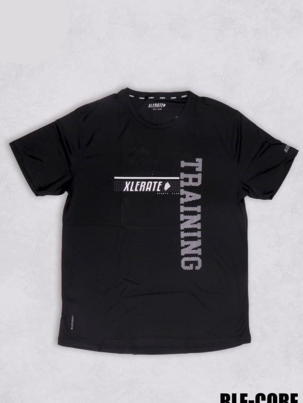 Train harder with the RLE-CORE Black Training Sports T-Shirt. Featuring bold “XLERATE Training” graphics and quick-dry fabric for performance and style.