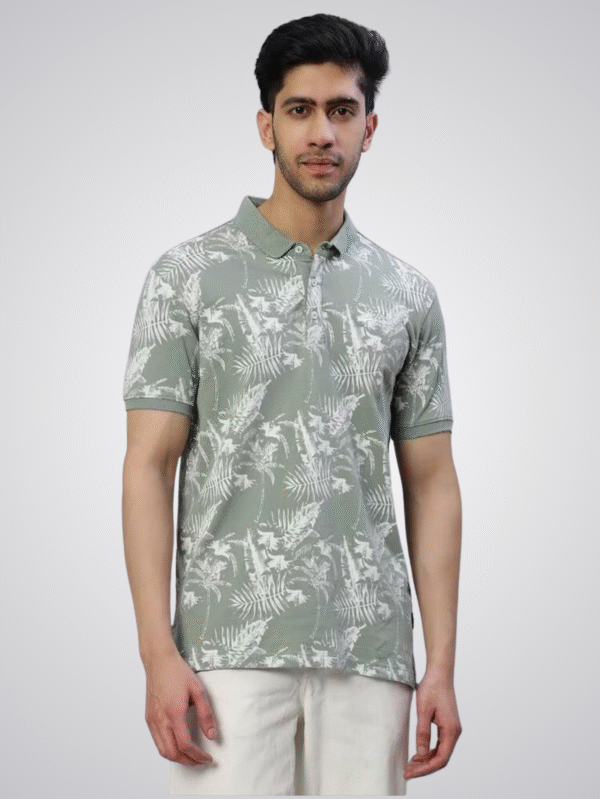 Trendy olive green polo T-shirt with white tropical leaf print. Made from soft breathable cotton, ideal for casual and semi-casual wear.