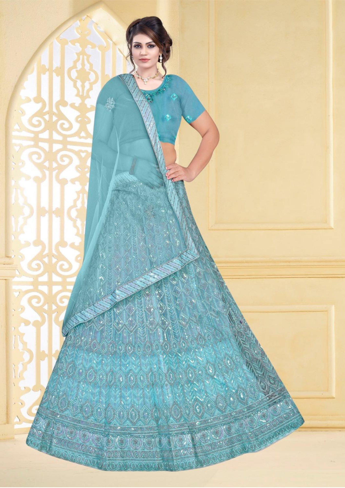 Elevate your festive elegance with this Aqua Blue Damini-L Net Designer Embroidered Sequin Lehenga Choli, a perfect blend of sophistication and glamour. Crafted from premium-quality net fabric, this ensemble features intricate sequin, zari, and thread embroidery that beautifully enhances its charm. The blouse comes with delicate detailing, while the net dupatta with embroidered border adds a graceful finishing touch. Perfect for weddings, sangeet, or festive celebrations, this lehenga choli embodies timeless luxury and style for the modern woman.