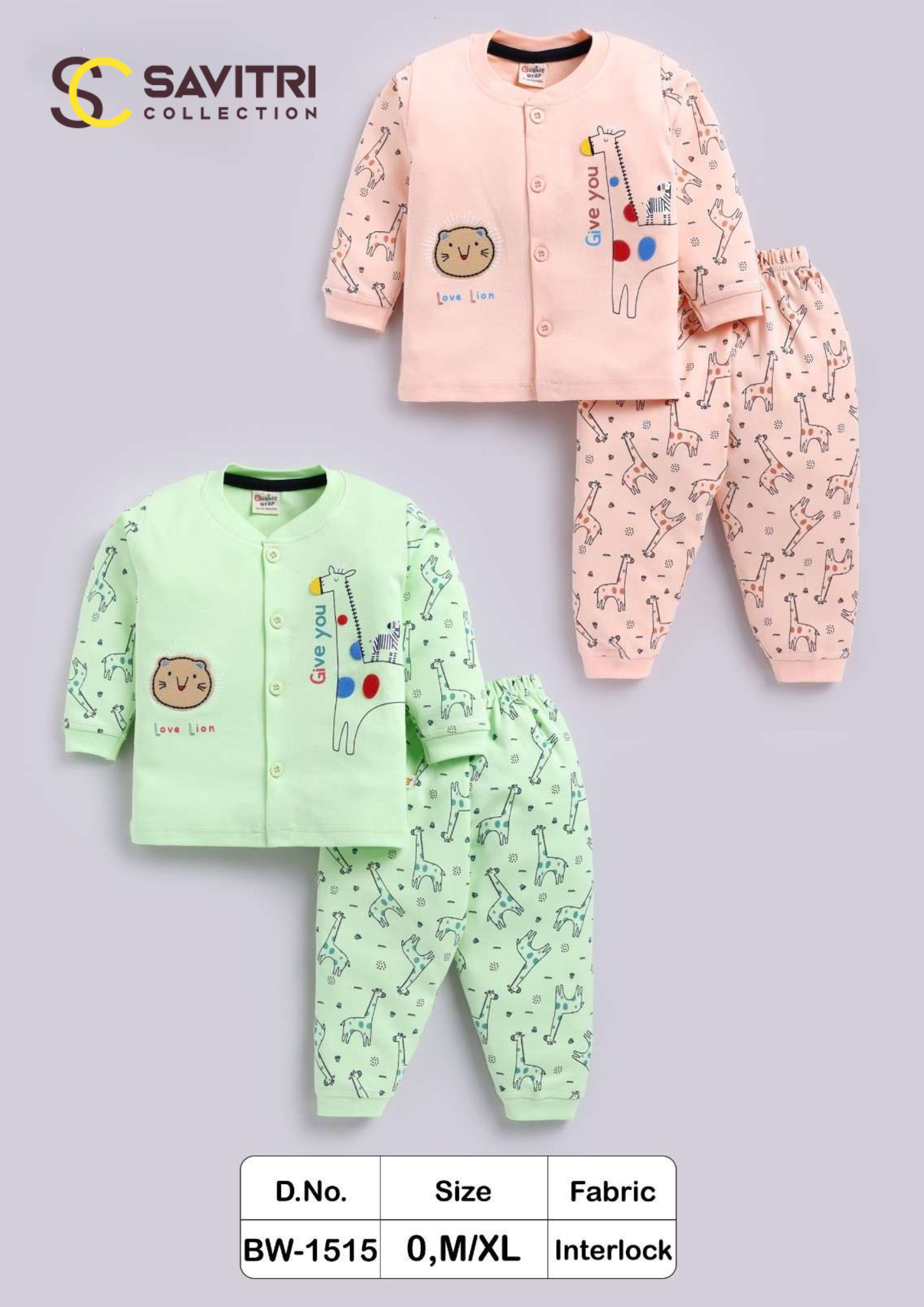 Dress your little one in pure comfort with the Savitri Collection Baby Interlock Night Suit Set (BW-1515). Crafted from premium Interlock fabric, this set ensures extra softness and durability, making it perfect for delicate baby skin. The full-sleeve button-down top features adorable lion and giraffe prints, while the matching pajama pants come with an elastic waistband for a snug yet comfortable fit. Available in pastel peach and mint green shades, this nightwear is designed to keep babies cozy all day and night.