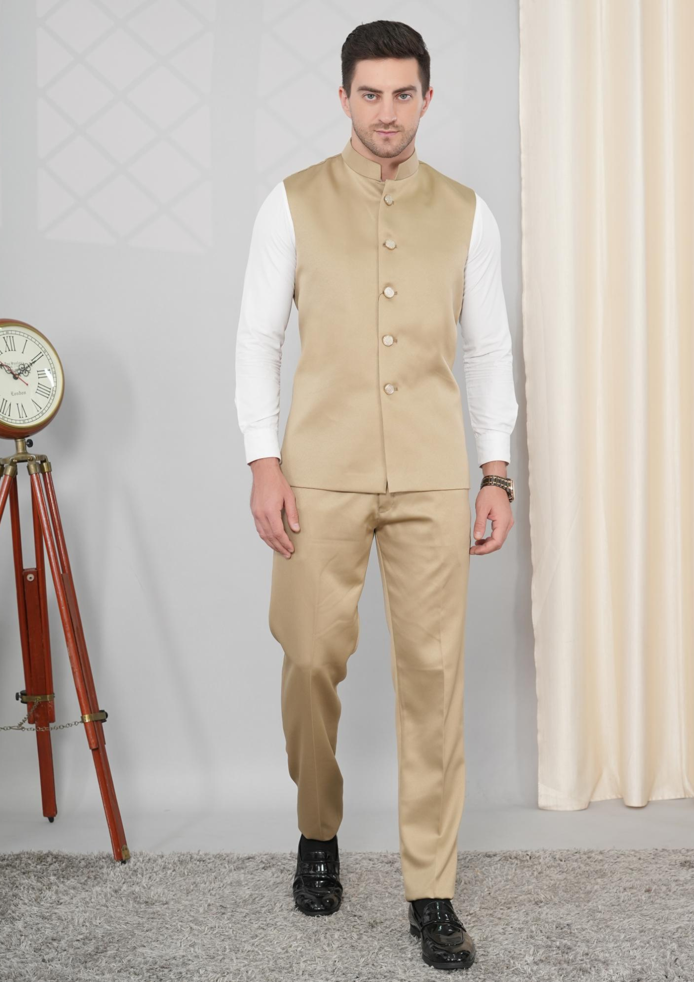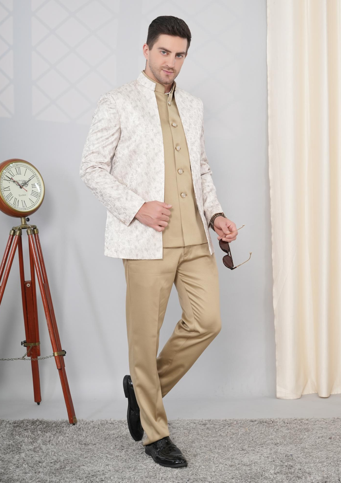 Beige & Golden Imported Indo-Western Suit with Textured Jacket – SNA-MSU**