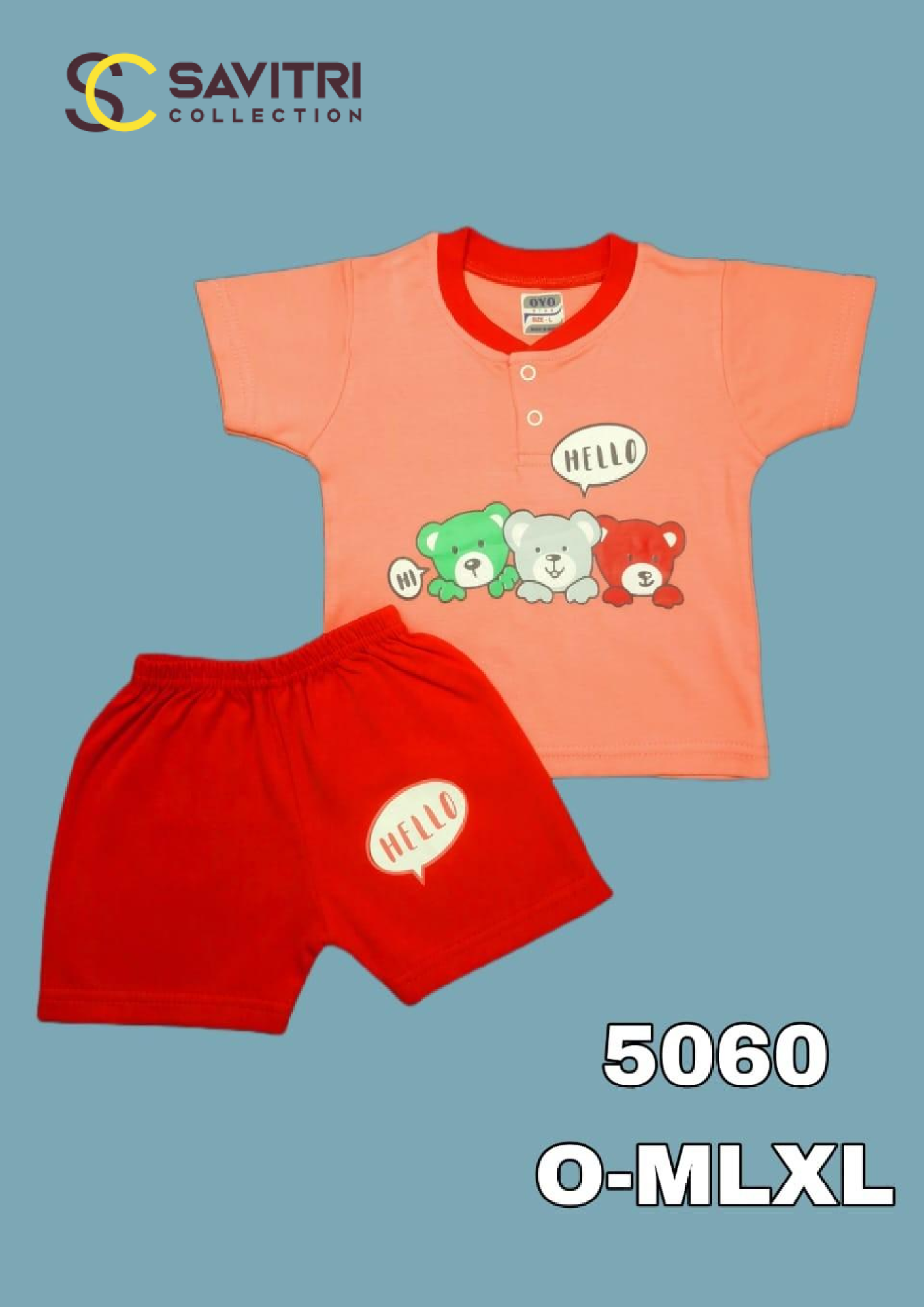 Add a pop of playful charm to your little one’s wardrobe with the Savitri Collection Boys’ Co-ord Set – Style 5060. This adorable combo features a peach t-shirt with a bold red collar, adorned with cute teddy bear prints and fun speech bubbles saying “Hi” and “Hello”. It’s paired with matching red shorts that also feature a “Hello” bubble for a coordinated look.