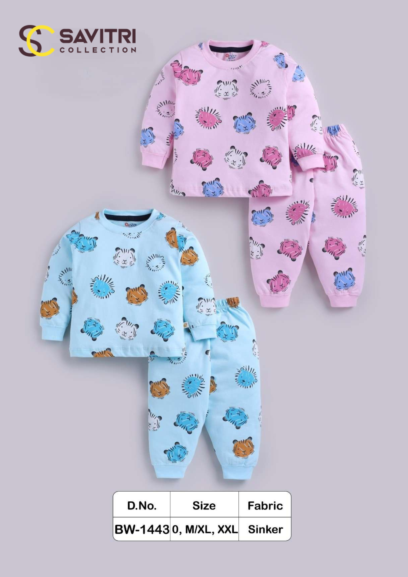 Add charm and comfort to your little one’s wardrobe with the BW-1443 Cartoon Animal Print Kidswear Set. This adorable two-piece outfit includes a soft full-sleeve top and matching elastic waist bottoms, crafted from premium sinker cotton fabric for all-day comfort.