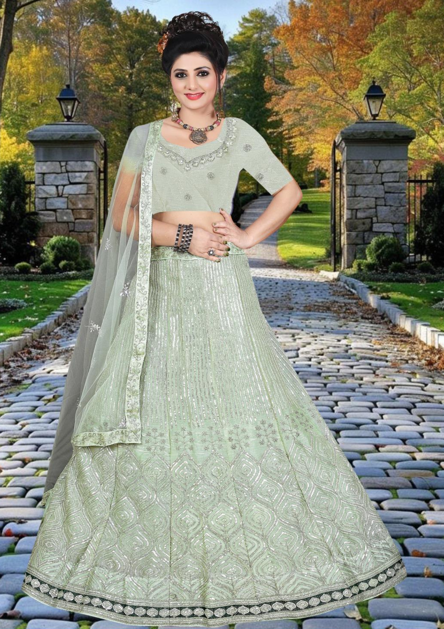 Turn every head your way with this exquisite Dhoom Mint Green Designer Sequined Net Lehenga Choli Set. This stunning attire beautifully blends modern shimmer with traditional embroidery, making it a perfect choice for weddings, receptions, and festive occasions. The lehenga is crafted from premium net fabric with intricate sequin and thread detailing, creating a sparkling yet elegant look. The matching blouse adds a touch of sophistication with subtle embroidery, while the net dupatta completes the ensemble with a delicate embroidered border. Step into elegance and glamour with this show-stopping outfit from Utsav Ethnics.