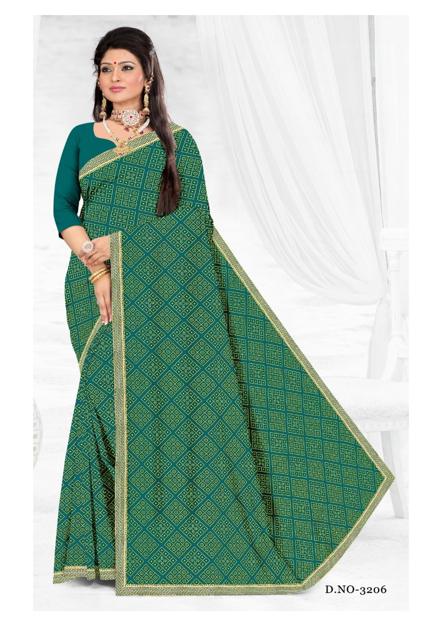 Add timeless beauty to your ethnic collection with this Elegant Green Geometric Printed Saree (D.No.3206). Featuring a stunning combination of traditional geometric prints and a subtle golden border, this saree perfectly balances modern design with classic elegance.