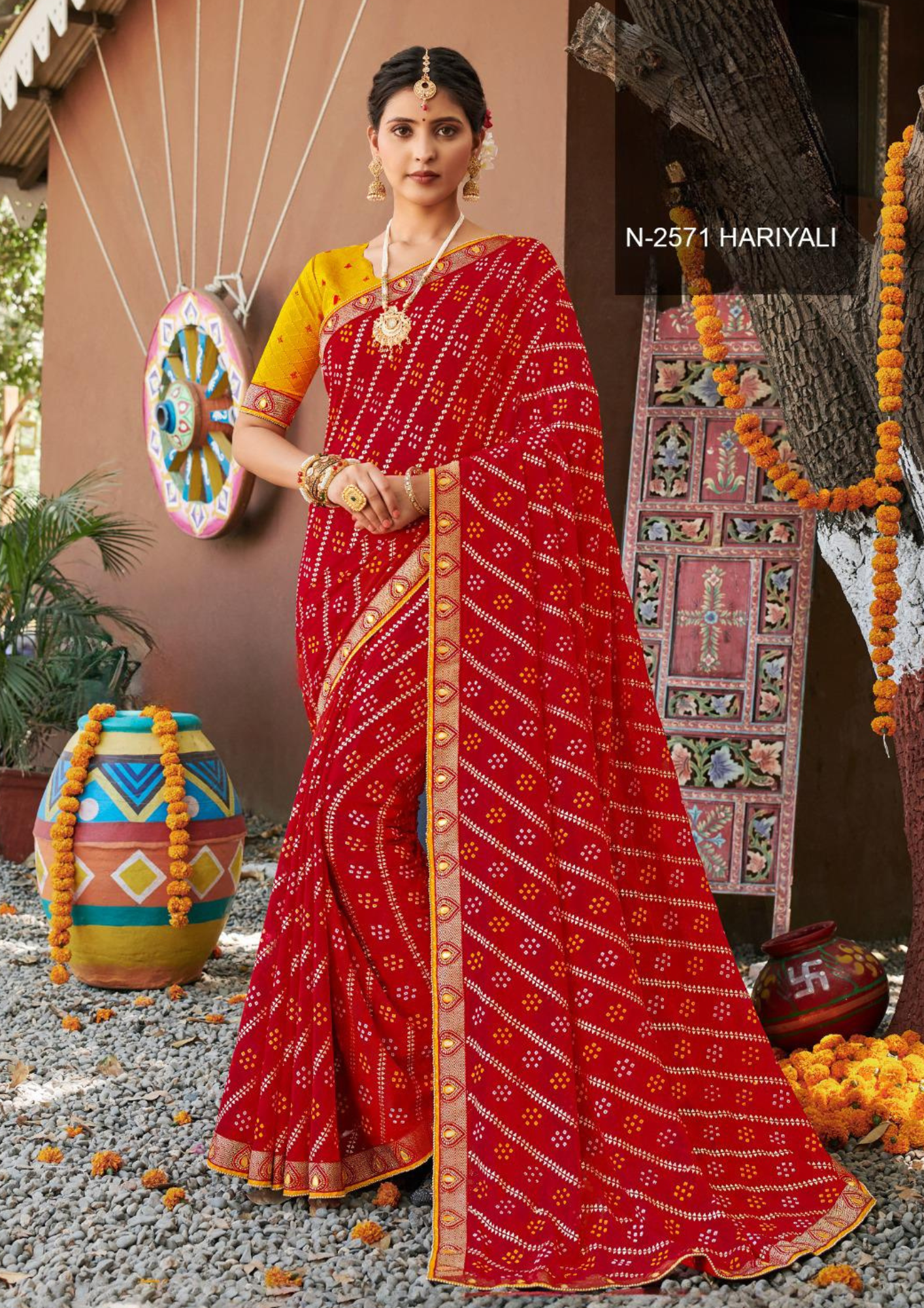 Elegant Red Bandhani Saree with Mustard Yellow Blouse
