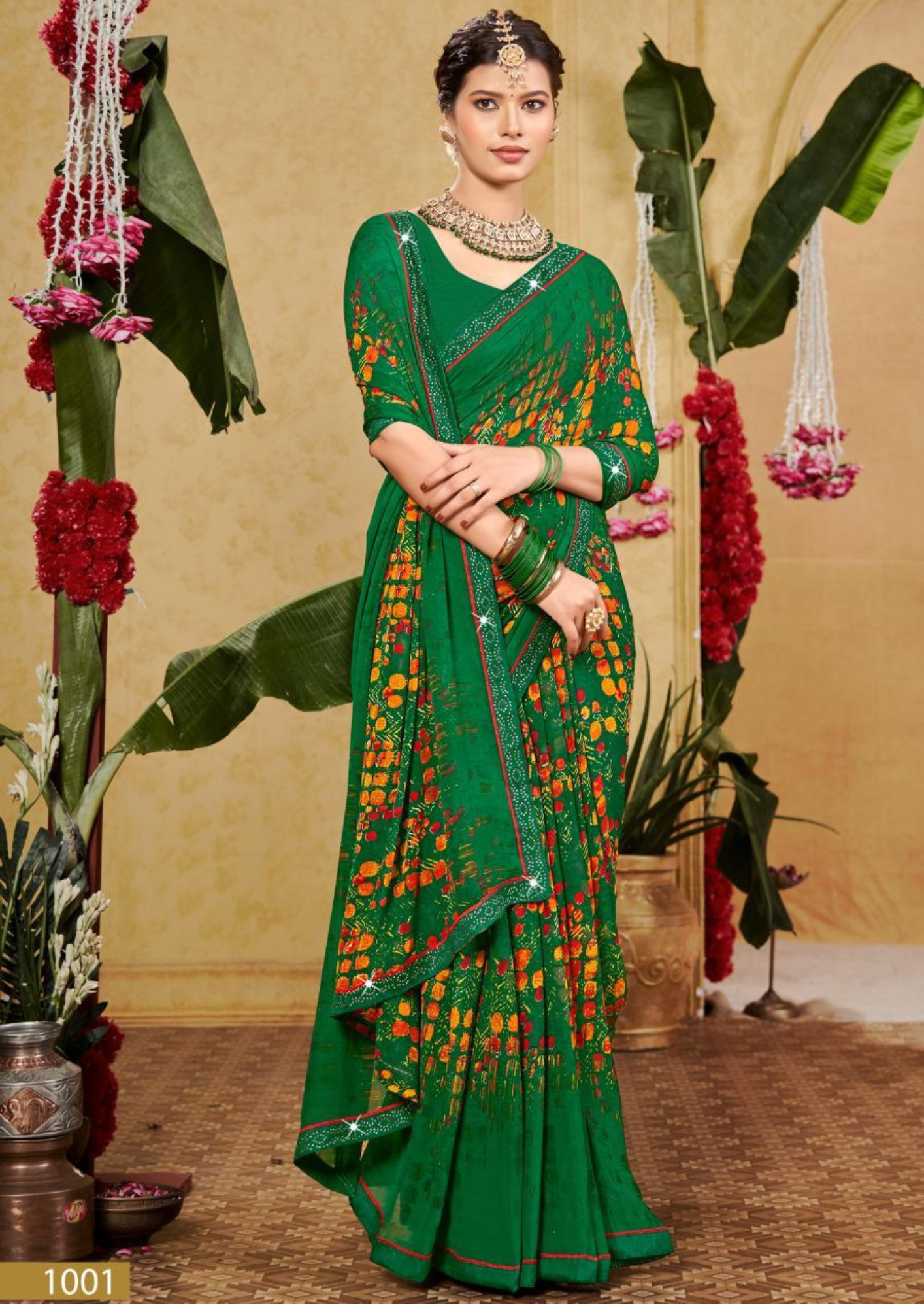 Step into timeless elegance with this Emerald Green Georgette Saree, designed to bring out the festive spirit in you. The saree features a captivating orange and yellow floral Bandhani-inspired print, beautifully balanced with a sparkling shimmer border that enhances its traditional grace.