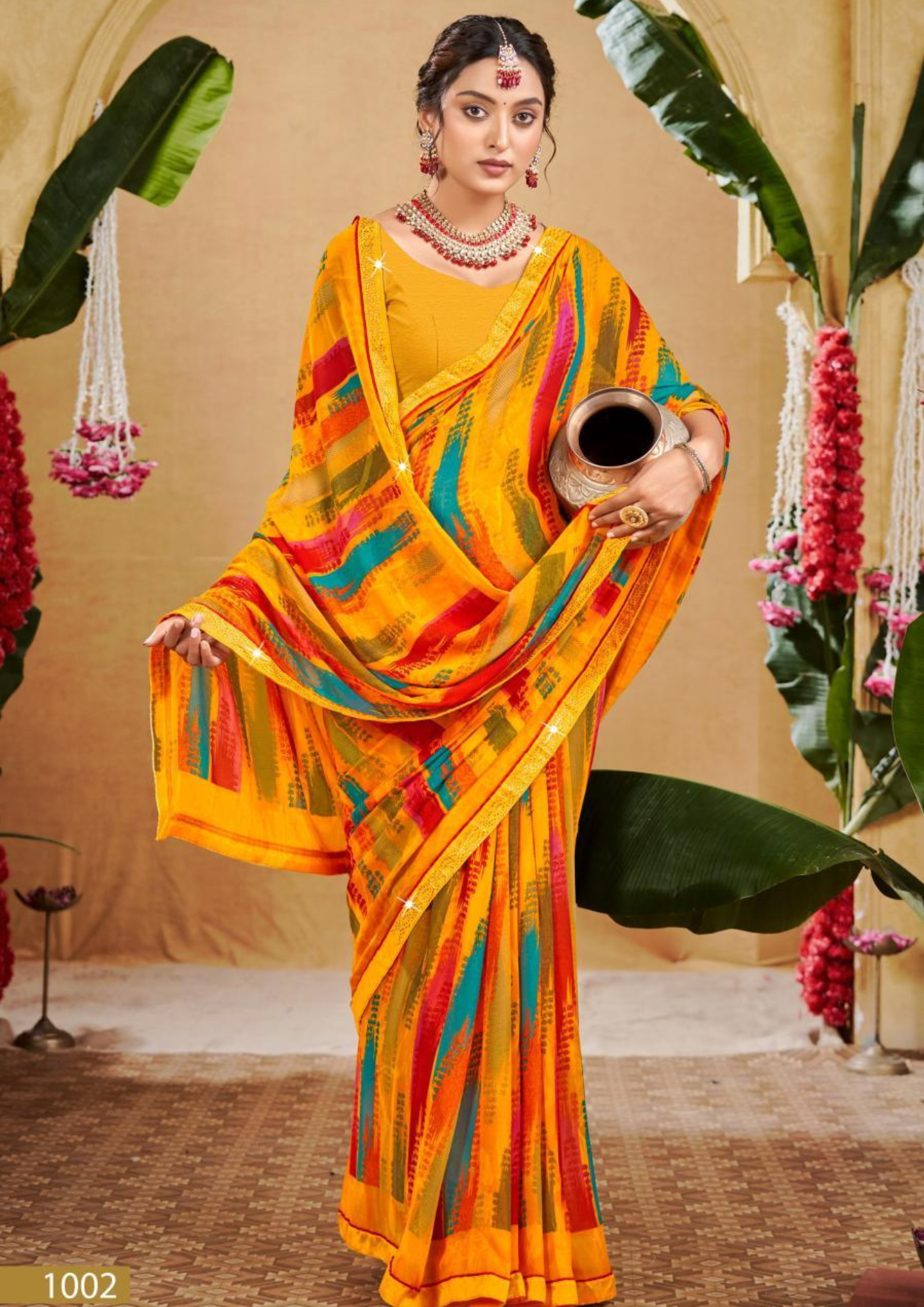 Radiate festive charm with this stunning Golden Mustard Georgette Saree, designed with a vibrant multicolor brush-stroke print that blends tradition with modern artistry. The rich mustard yellow base accentuates the lively shades of red, green, and blue, making it an eye-catching piece for any celebration.