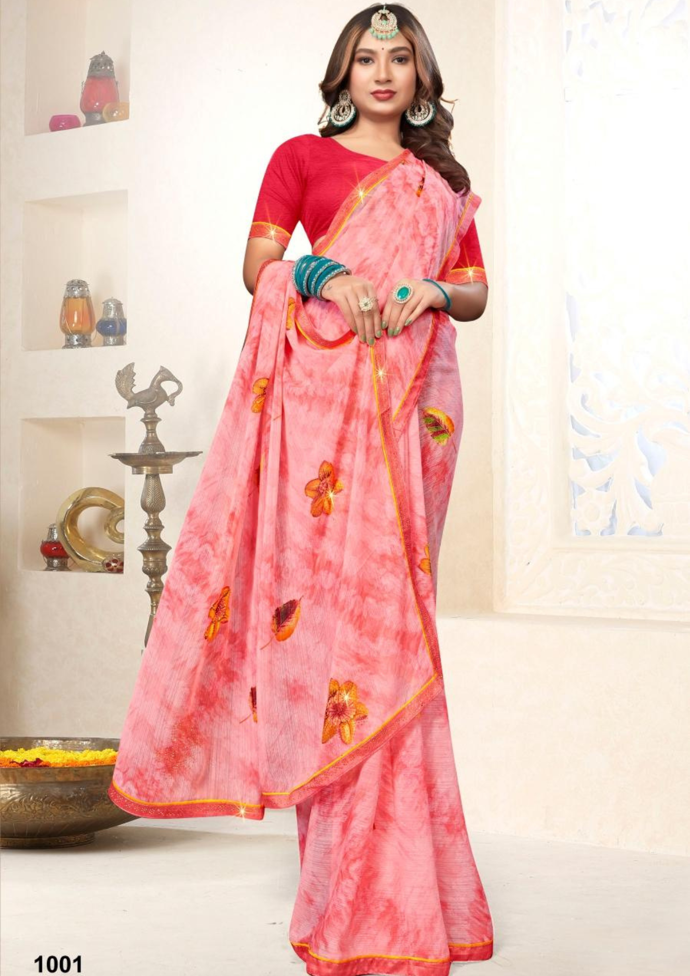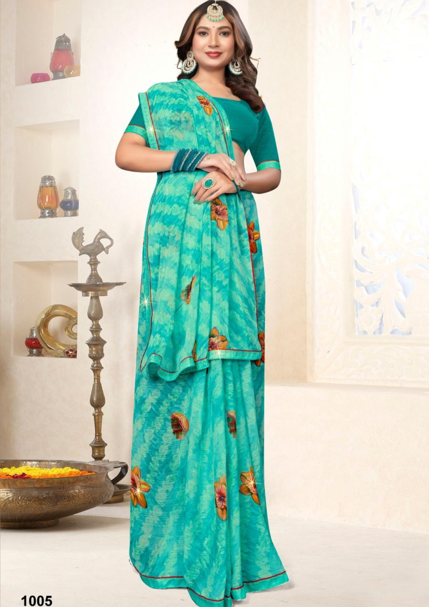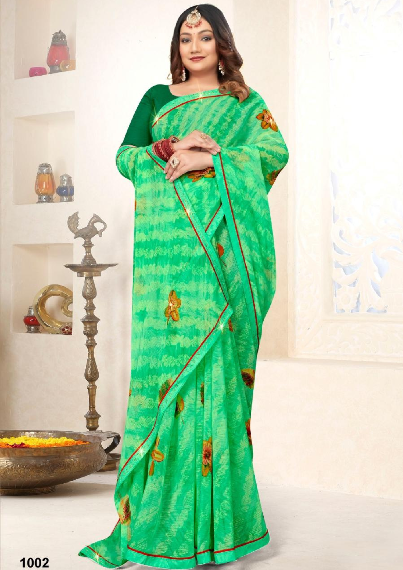 Crafted from soft georgette-like fabric, it ensures a light and comfortable drape, perfect for festive occasions, family gatherings, and cultural events. The delicate tie-dye texture paired with handcrafted floral work gives this saree a refreshing, youthful appeal.