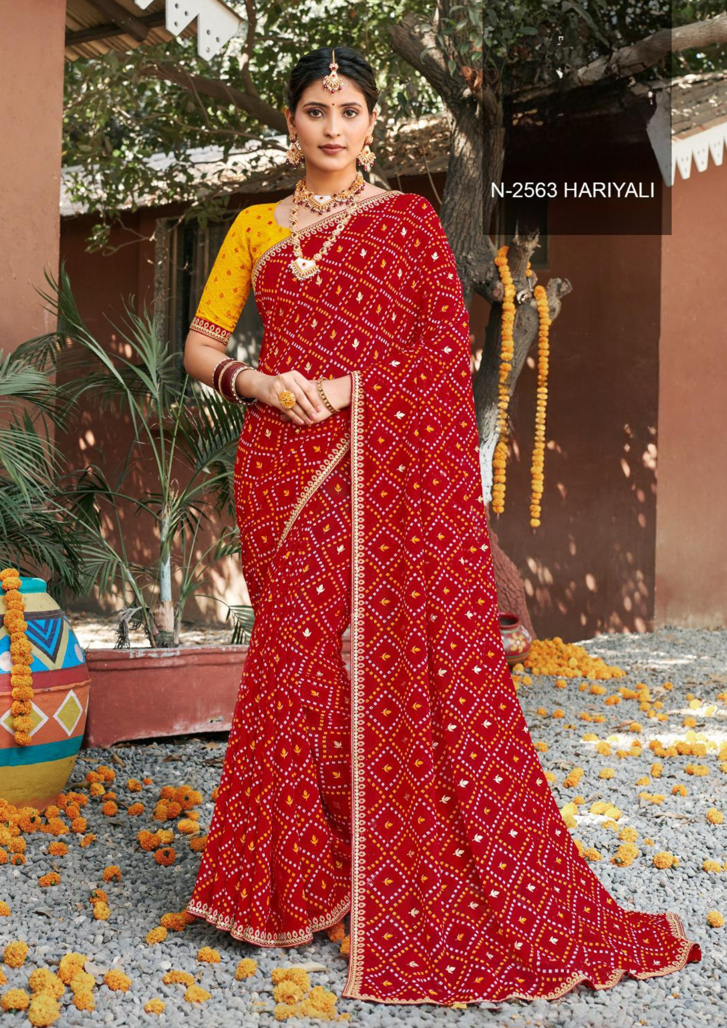 Bring timeless elegance to your ethnic collection with the N-2563 Hariyali Bandhej Saree, a true embodiment of Rajasthani tradition. This saree comes in a vibrant red tone adorned with classic diamond-shaped Bandhej motifs, delicately spread across the entire body. The eye-catching gota patti border adds shimmer and structure, while the bold yellow contrast blouse with fine embroidery completes the regal look.