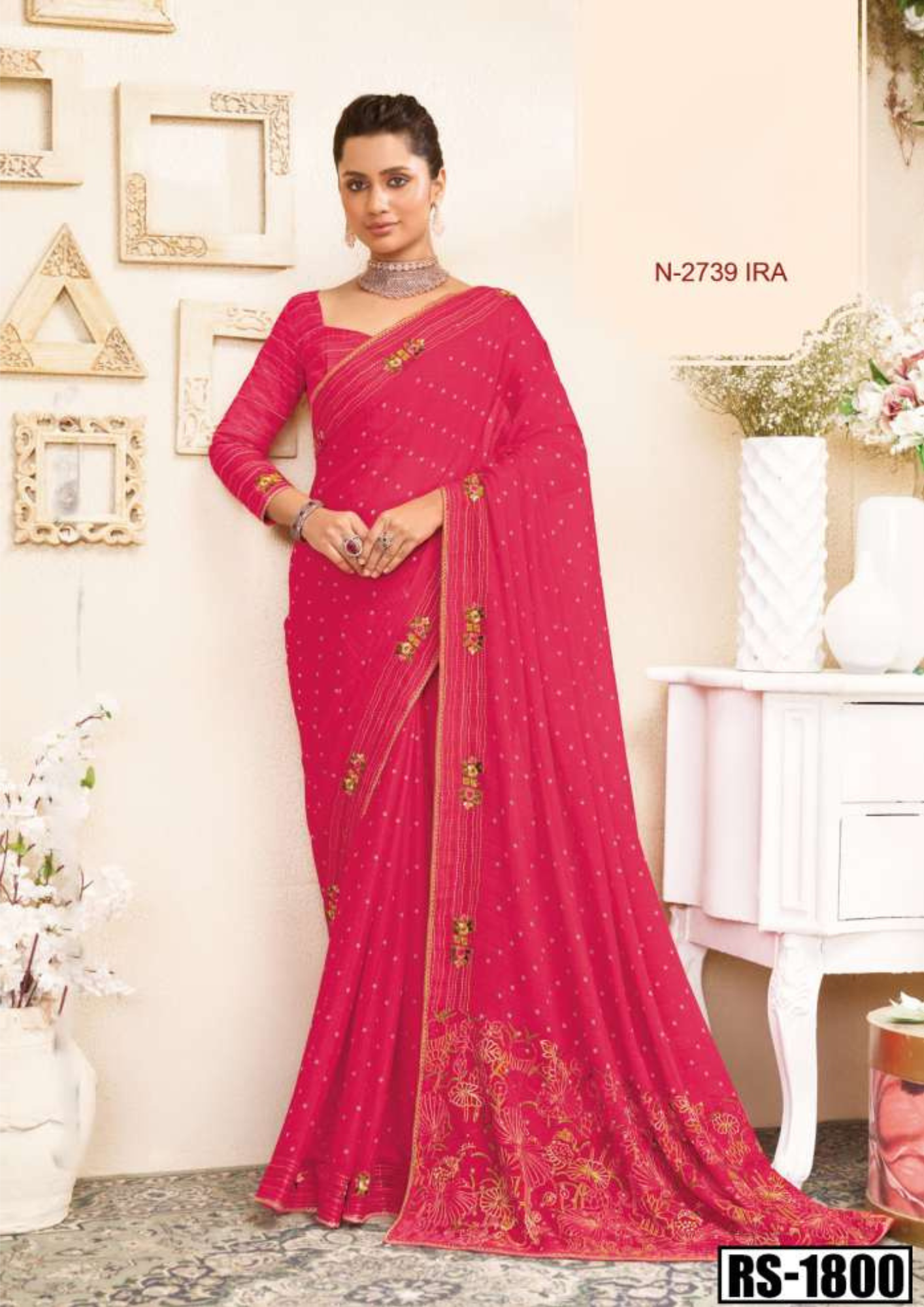 Step into timeless elegance with the Ira N-2739 Pink Saree from the Savitri Collection. This stunning piece features a vibrant pink base enhanced with delicate golden thread embroidery and scattered dotted patterns for a subtle sparkle. The floral detailing on the pallu adds a feminine touch, making this saree perfect for festive occasions, poojas, or family gatherings.