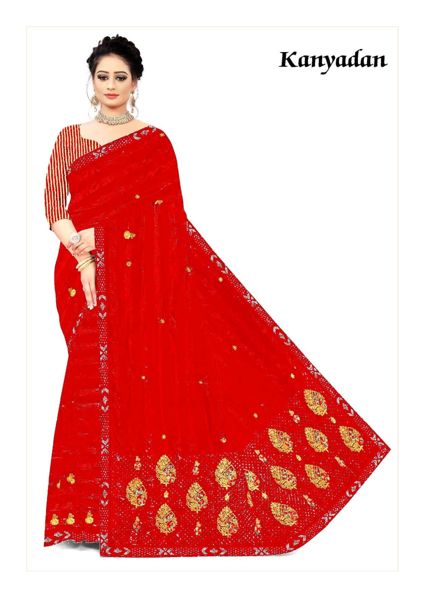 Step into elegance with the Kanyadan Red Bandhani Printed Saree, a perfect blend of tradition and contemporary grace. This saree showcases a classic red base adorned with intricate golden motifs and a beautifully designed pallu that enhances its festive appeal. The lightweight fabric ensures comfort while maintaining a rich and royal look — ideal for weddings, religious ceremonies, and festive occasions.