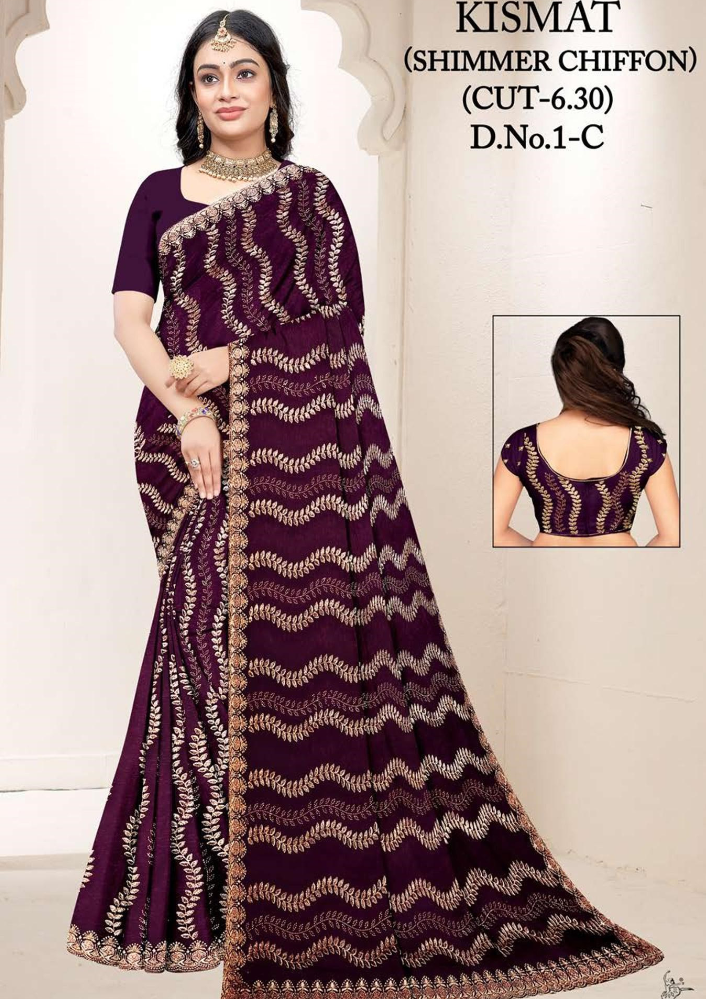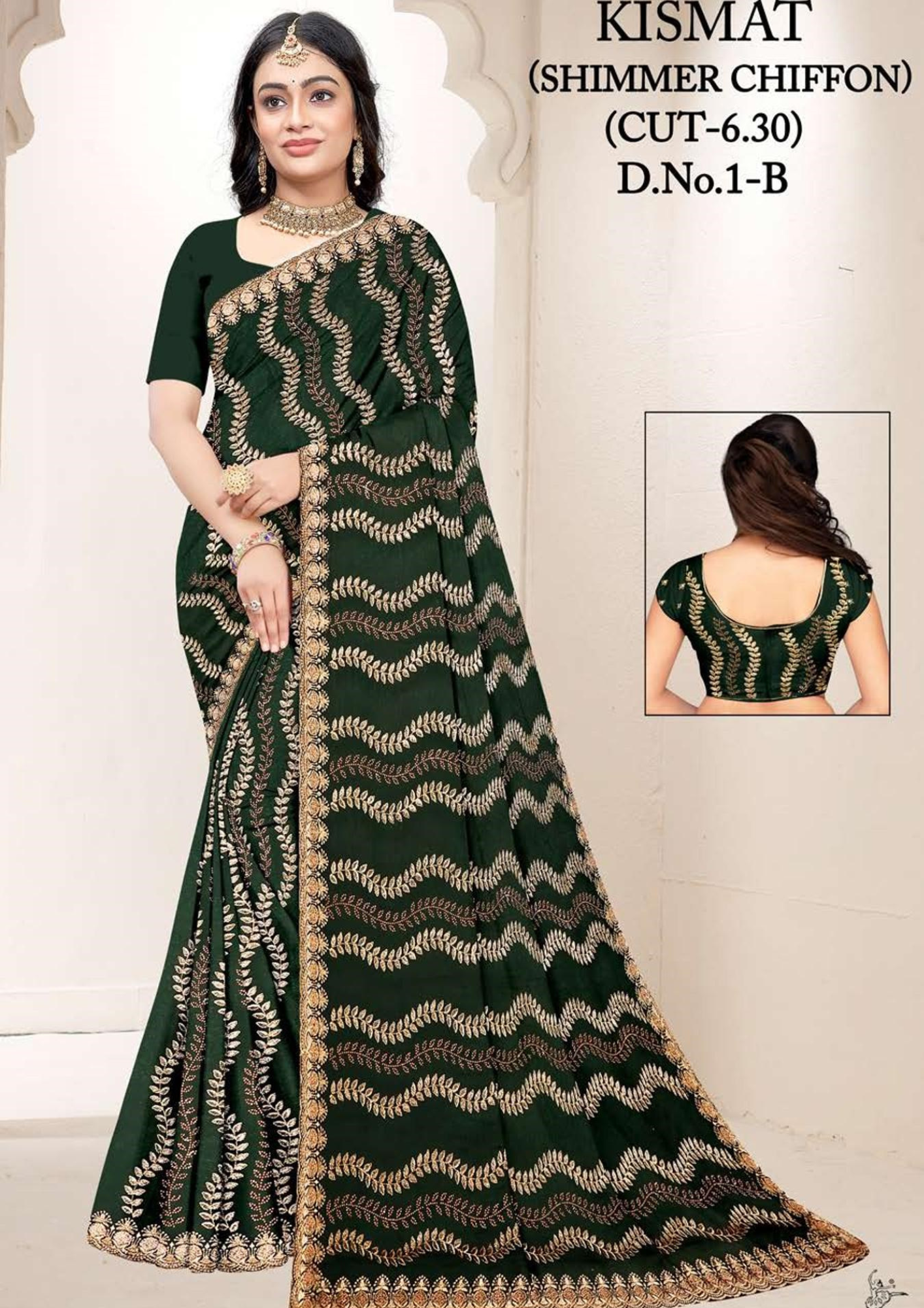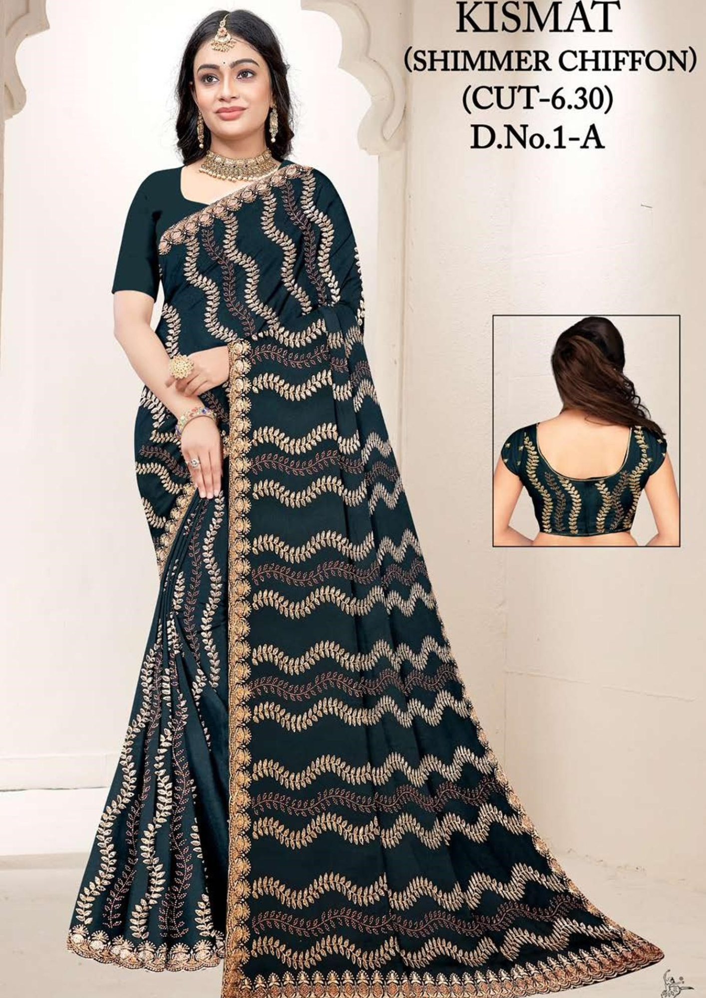 Drape yourself in elegance with the Kismat Shimmer Chiffon Saree, a perfect blend of modern charm and traditional sophistication. Crafted from premium shimmer chiffon fabric, this saree features a captivating deep teal base beautifully adorned with golden leaf embroidery in wavy patterns. The subtle shimmer adds a graceful glow, making it ideal for festive occasions, receptions, and parties.