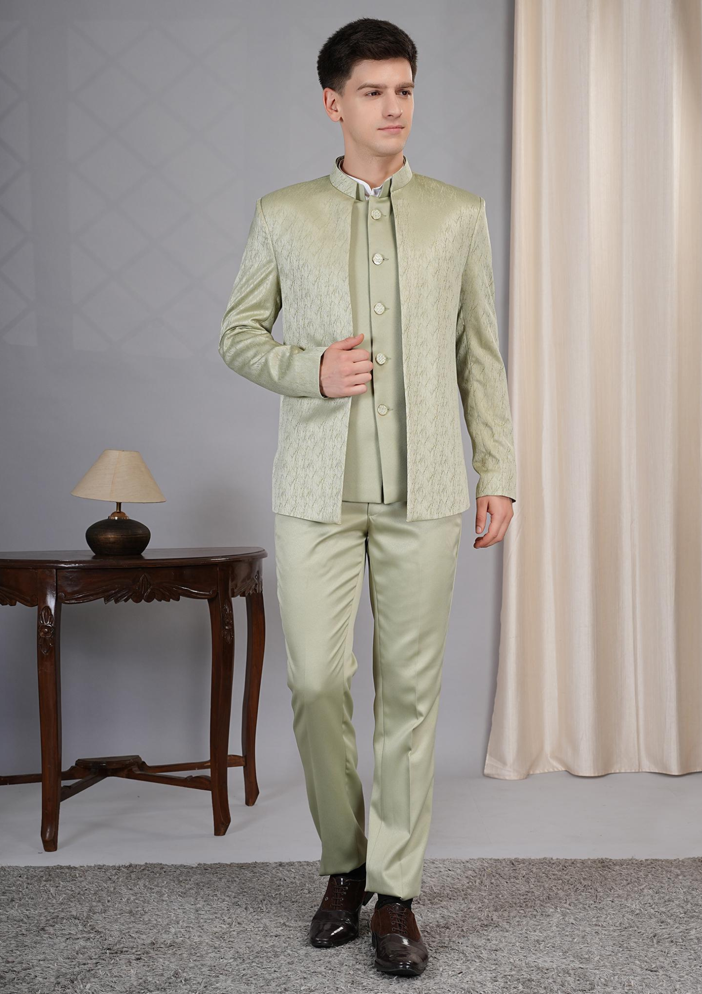Exude sophistication and charm with this Light Green Indo-Western Suit, a perfect fusion of modern tailoring and ethnic elegance. Crafted from premium fabric, this outfit features a textured jacket with a mandarin collar, designer buttons, and matching slim-fit trousers. The soothing light green shade makes it a refreshing choice for weddings, receptions, festive occasions, and parties. Designed for the contemporary gentleman, this suit ensures comfort, style, and a commanding presence.