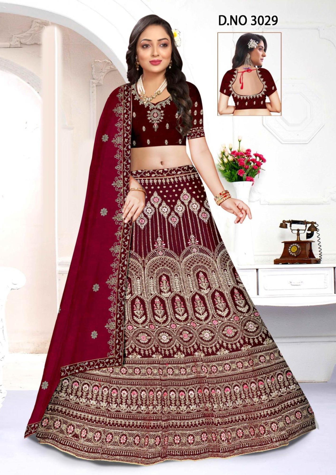 Majestic Maroon Velvet Embroidered Bridal Lehenga Choli with Zari & Jarkan Diamond Work – D.No 3029