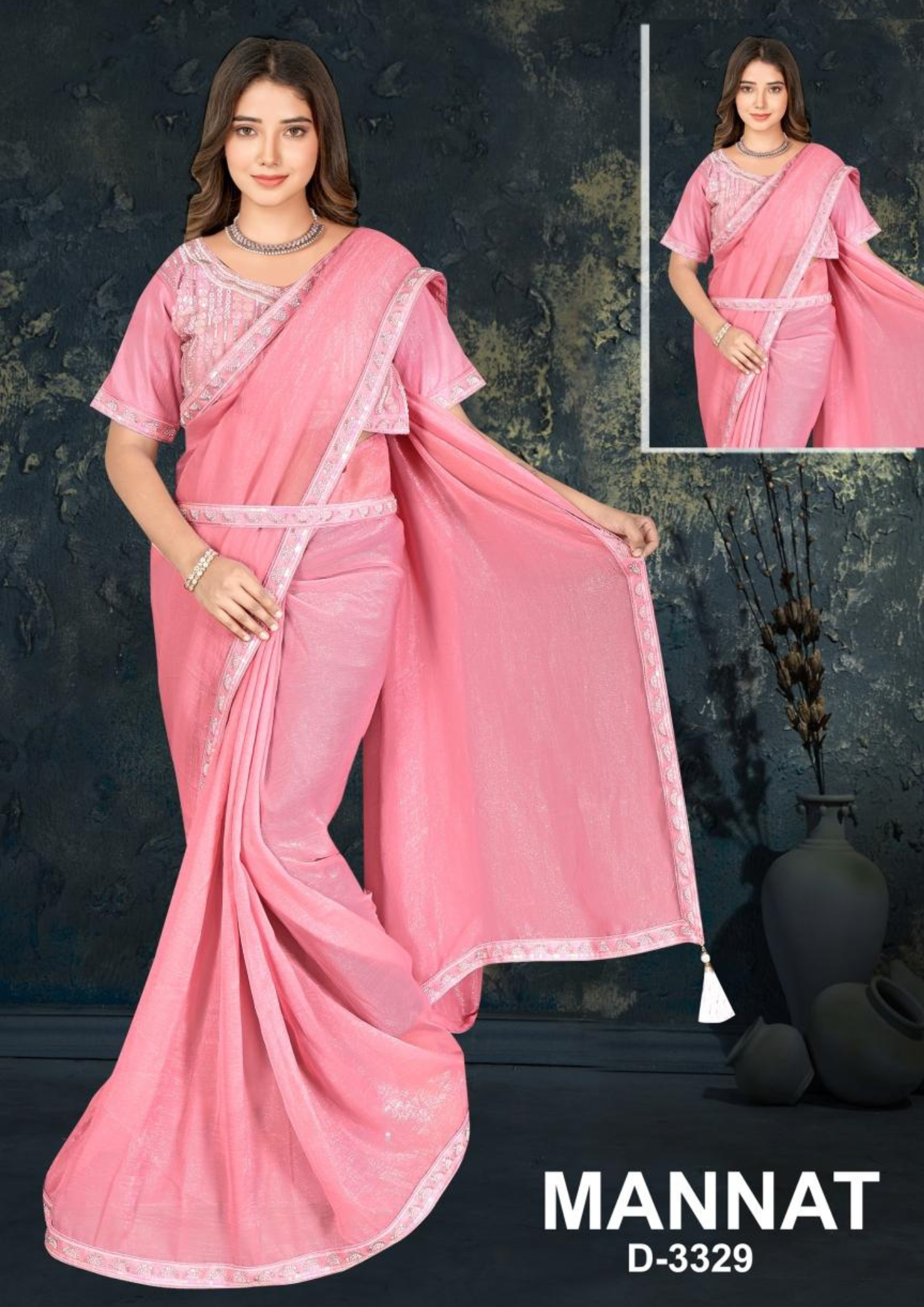 Grace your ethnic collection with the Mannat D-3329 Baby Pink Crunchi Saree, a perfect blend of simplicity, style, and sophistication. Crafted from premium crunchi fabric, this saree offers a soft texture with a subtle sheen, ensuring a comfortable yet luxurious drape. The delicate baby pink color beautifully complements its intricate sequin embroidered border, giving it a refined and graceful appeal.