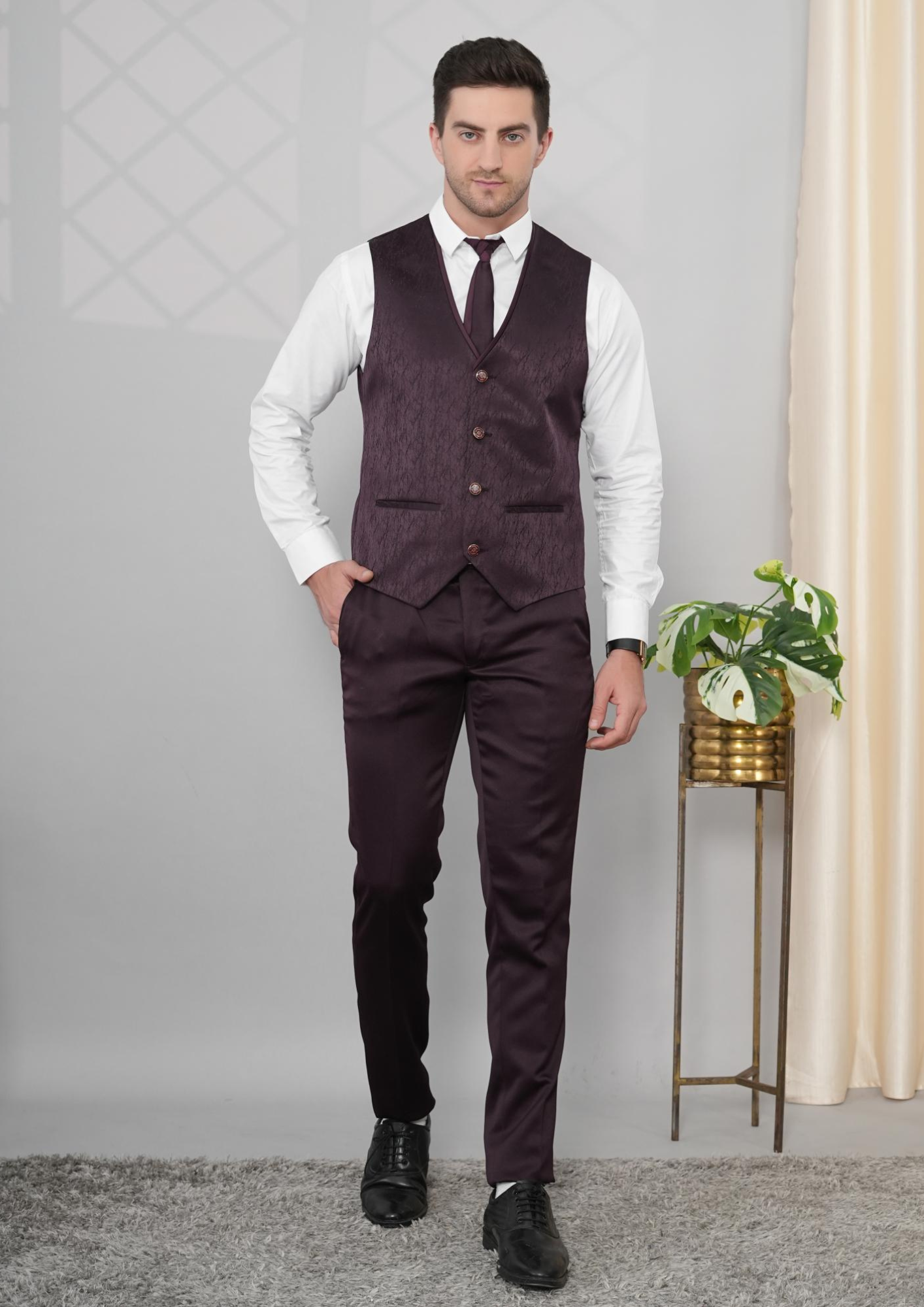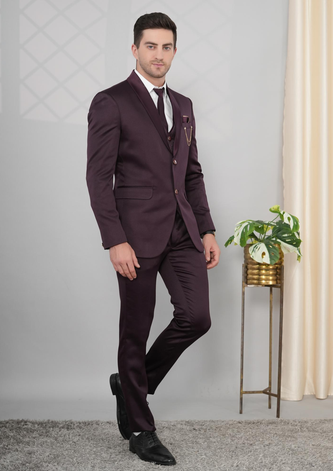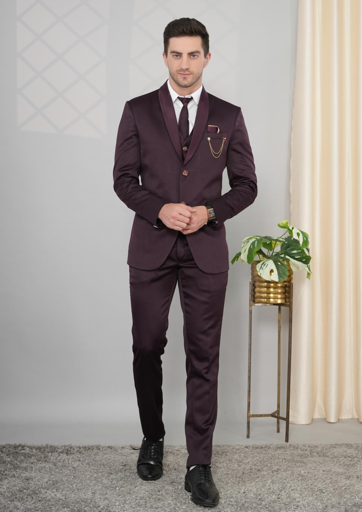 Showcase your refined style with our Maroon Imported Three-Piece Suit, a premium outfit tailored for men who want elegance with a touch of modern flair. This ensemble includes a maroon blazer, matching trousers, and a stylish designer waistcoat with intricate detailing. The coordinated pocket square and chain accessory add sophistication, making it perfect for weddings, receptions, parties, and formal occasions. Crafted from high-quality imported fabric, this slim-fit suit guarantees comfort, class, and confidence at every event.