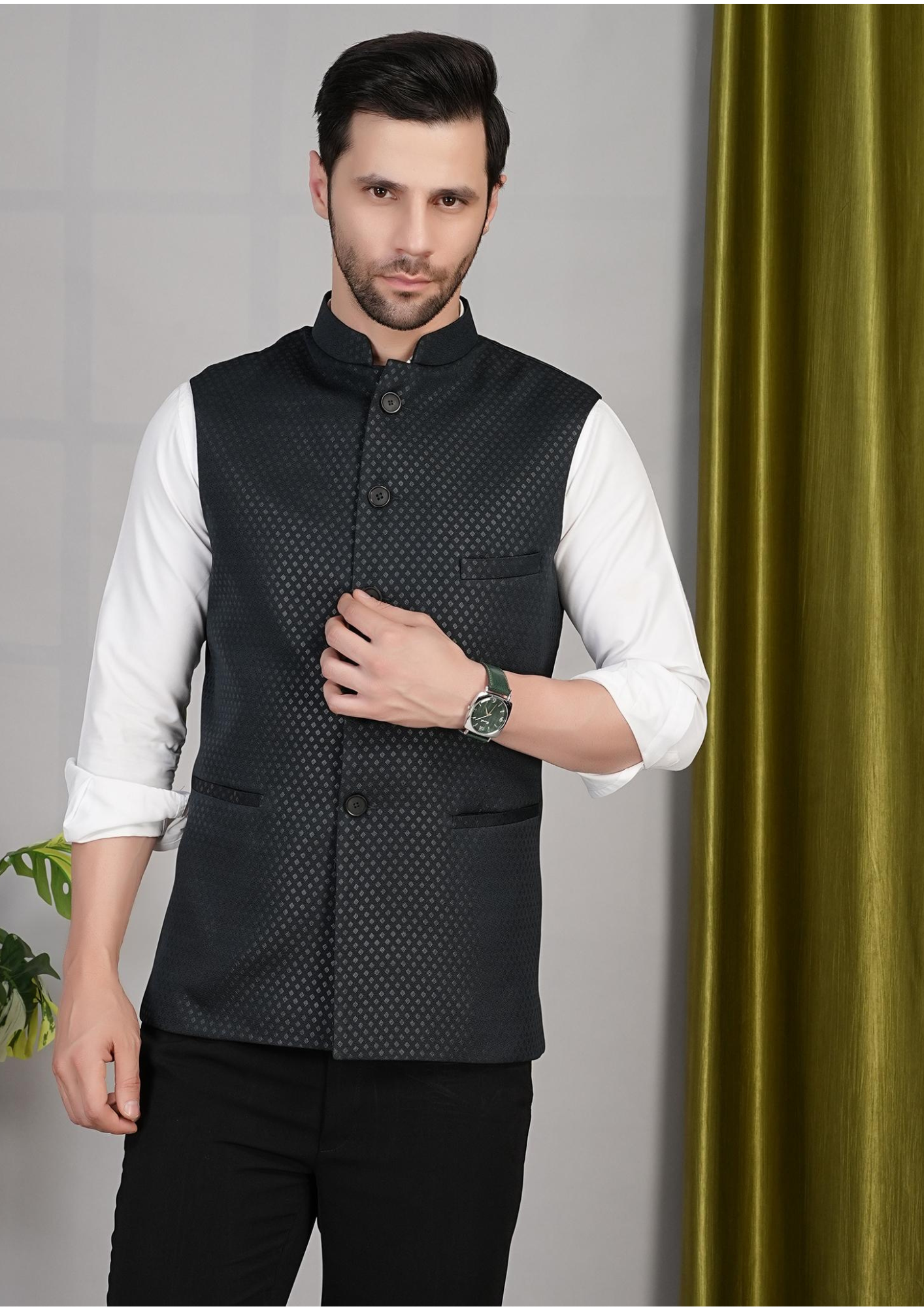 It features a mandarin collar, buttoned closure, welt side pockets, and a refined chest pocket, giving it a modern yet traditional appeal. Pair this black textured waistcoat with a crisp white shirt, kurta, or formal trousers to create a sharp and timeless look for weddings, parties, or corporate events.