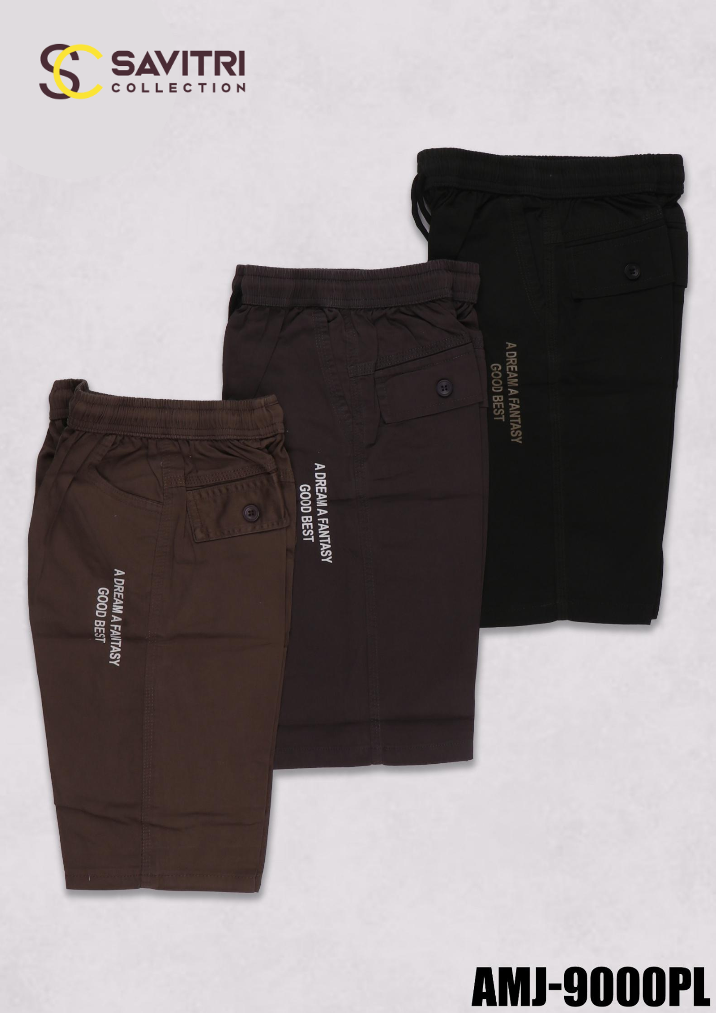 Upgrade your casual wardrobe with the Savitri AMJ-9000PL Men’s Plain Cargo Shorts, a perfect blend of utility, style, and comfort. These shorts come in versatile solid colors — Black, Dark Brown, and Coffee Brown — and feature a clean, minimal design with subtle text detailing that reads “A Dream A Fantasy, Good Best” for a modern streetwear touch.
