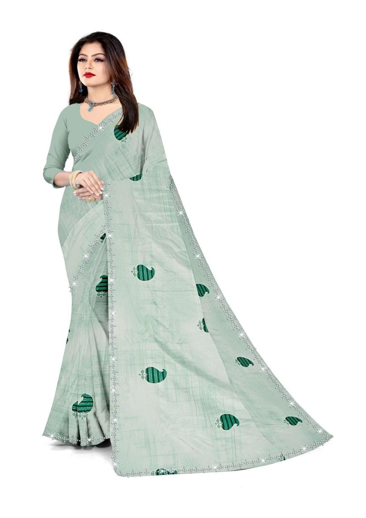 Elevate your ethnic wardrobe with the Mint Grace Designer Printed Saree, a timeless blend of elegance and simplicity. Crafted from premium lightweight fabric, this saree features a soft mint green base adorned with minimal yet eye-catching geometric motifs, creating a subtle yet sophisticated appeal. The delicate shimmering border adds a refined touch, perfect for women who love understated elegance.