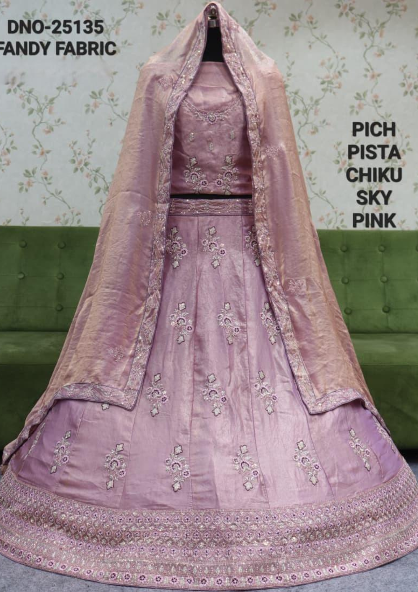Step into timeless elegance with our PBG-25135 Designer Lehenga Set, crafted from premium Fandy Fabric for a rich, glossy finish. This exquisite ensemble features delicate embroidery with shimmering threadwork and sequin accents, adding charm to every twirl. The soft pastel tone enhances its regal appeal, perfect for weddings, festive celebrations, and special occasions.