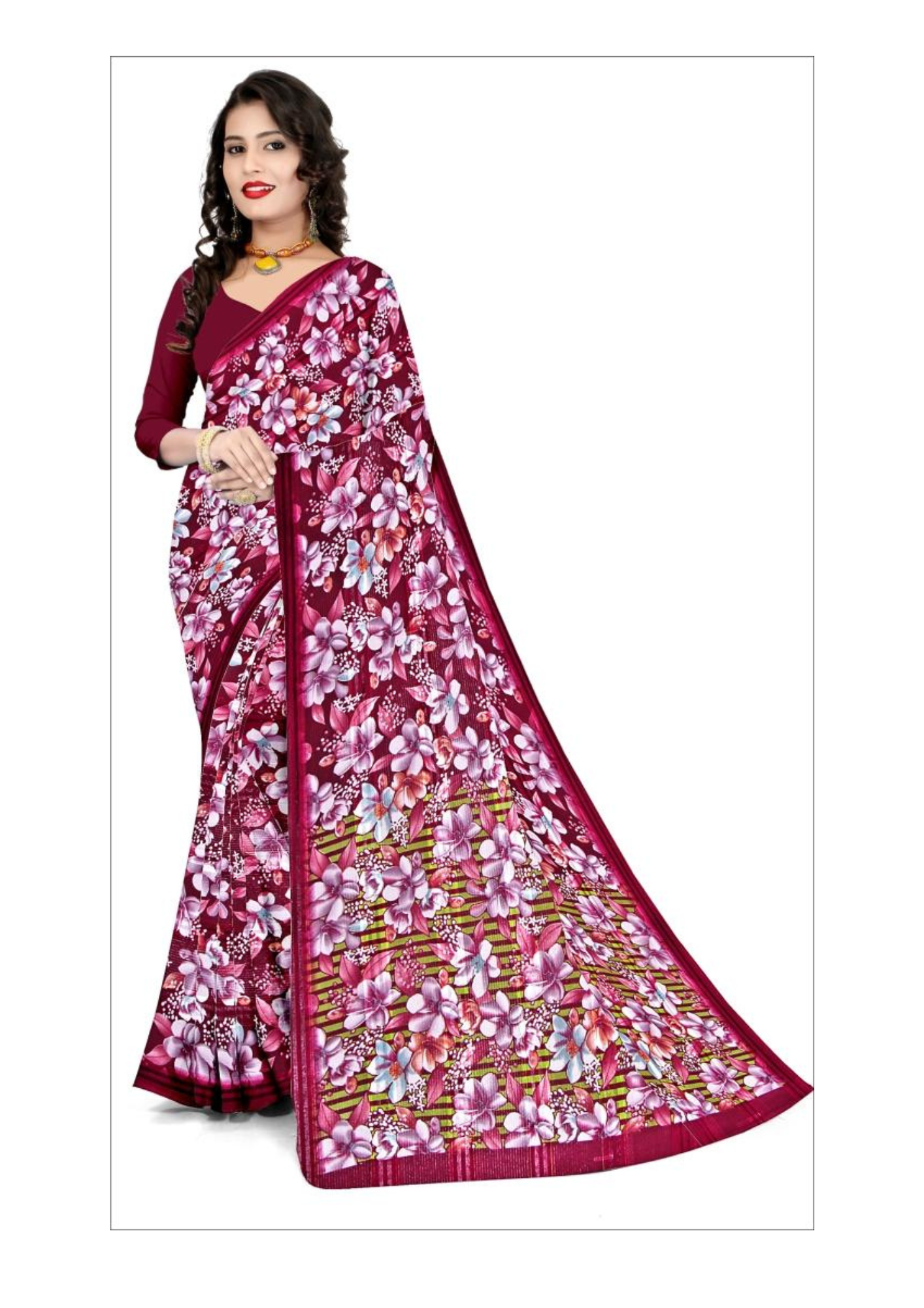 Add vibrant charm to your ethnic collection with our Royal Plum Floral Printed Georgette Saree, designed to make you stand out with its exquisite detailing and timeless elegance. Featuring a rich plum base adorned with intricate multicolor floral prints, this saree captures the essence of femininity and grace. The elegant woven-style border enhances its beauty, making it perfect for festive occasions, office wear, casual outings, or daily elegance.