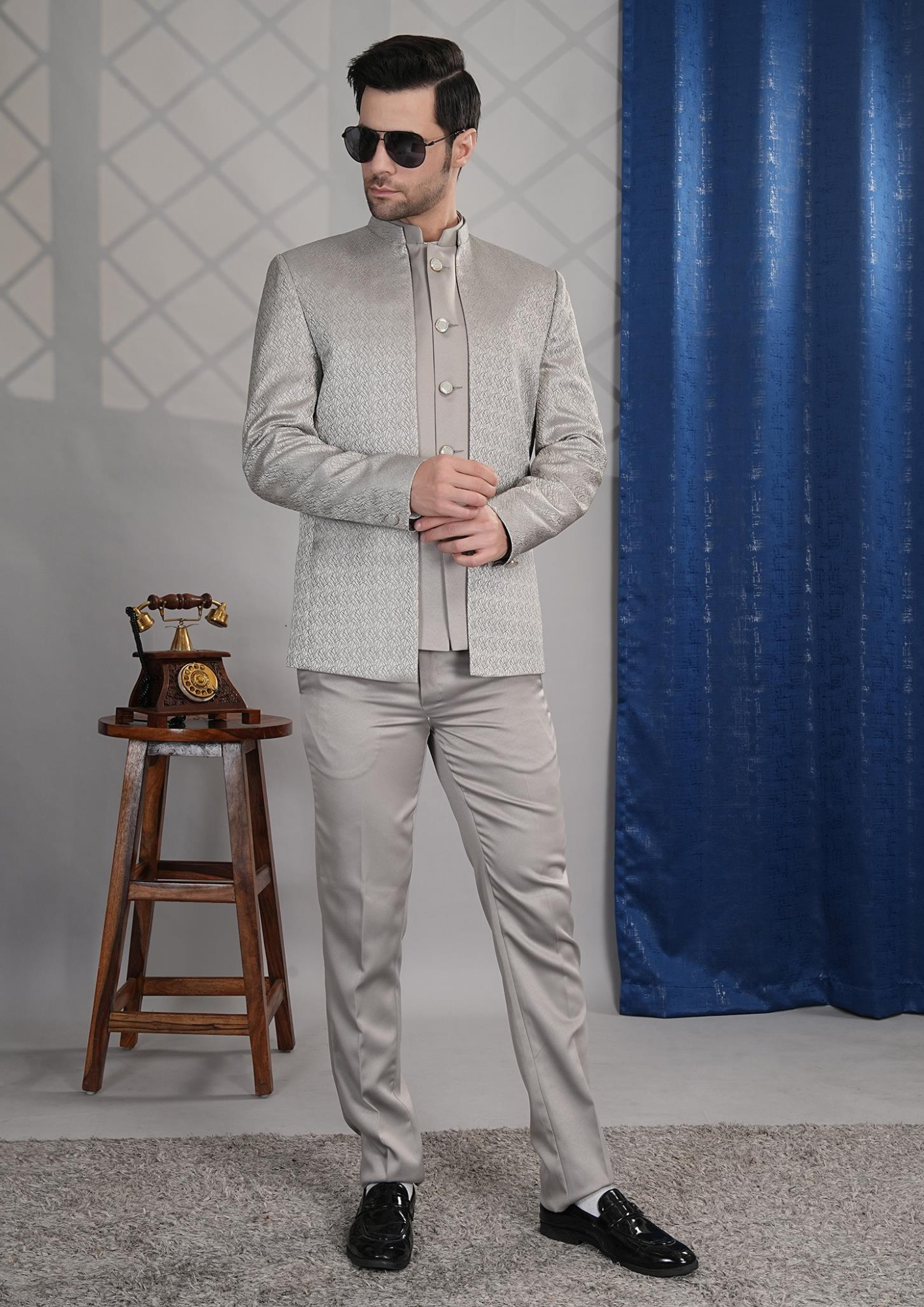 Make a refined style statement with this Silver Indo-Western Suit, designed for the modern man who values sophistication with tradition. The set features a textured silver jacket with a mandarin collar, designer metallic buttons, and a coordinated plain inner and trousers. The subtle sheen of the fabric adds a touch of luxury, making it an ideal choice for weddings, receptions, festive celebrations, and high-profile gatherings.
