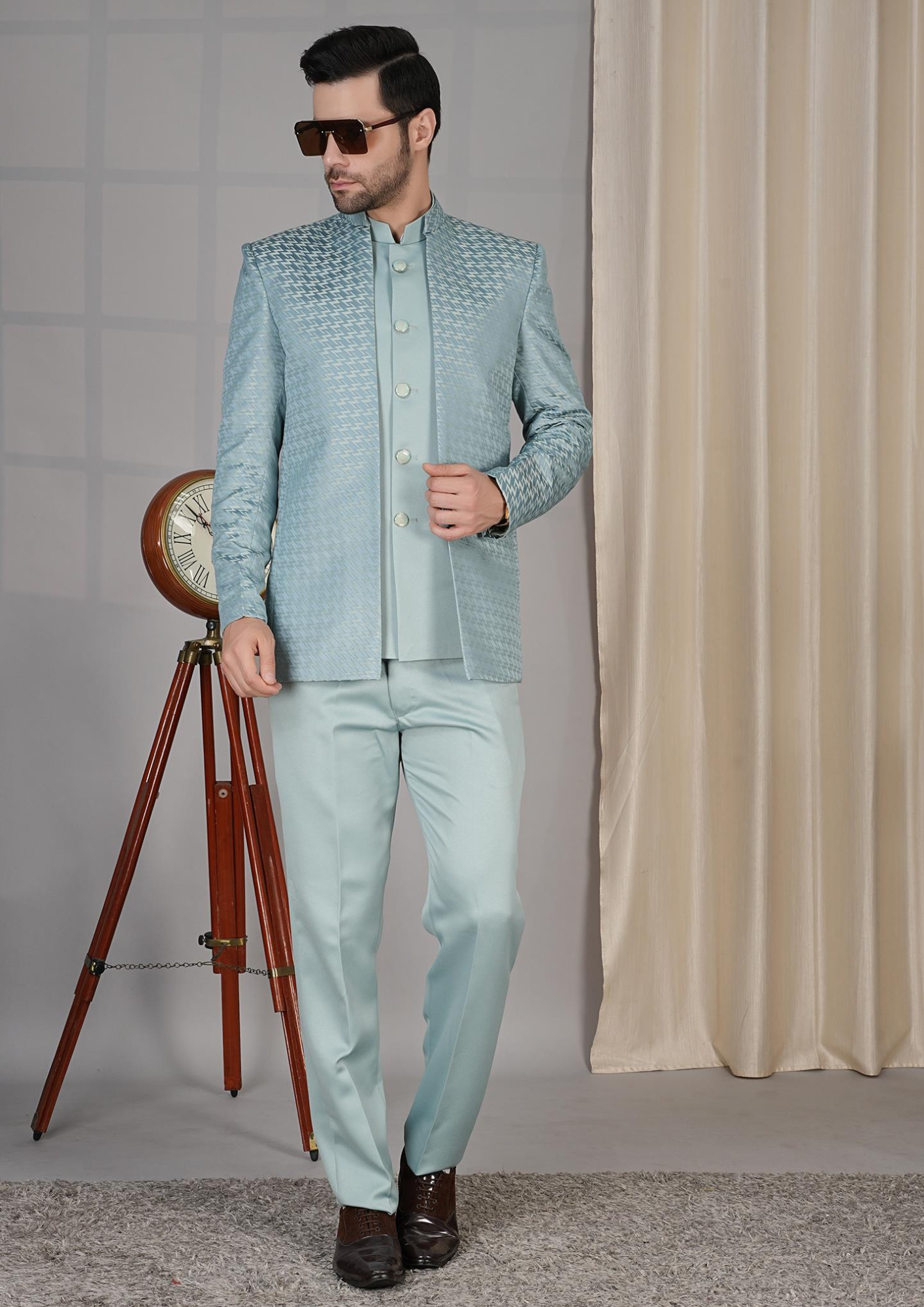 Add a touch of grace and royalty to your ethnic wardrobe with this Sky Blue Indo-Western Suit. Crafted from premium imported fabric, the jacket features a subtle self-textured pattern, mandarin collar, and designer buttons for a refined finish. Paired with matching slim-fit trousers, this outfit strikes the perfect balance between tradition and modern elegance. Ideal for weddings, receptions, engagement ceremonies, and festive celebrations, this suit ensures you stand out with sophistication.