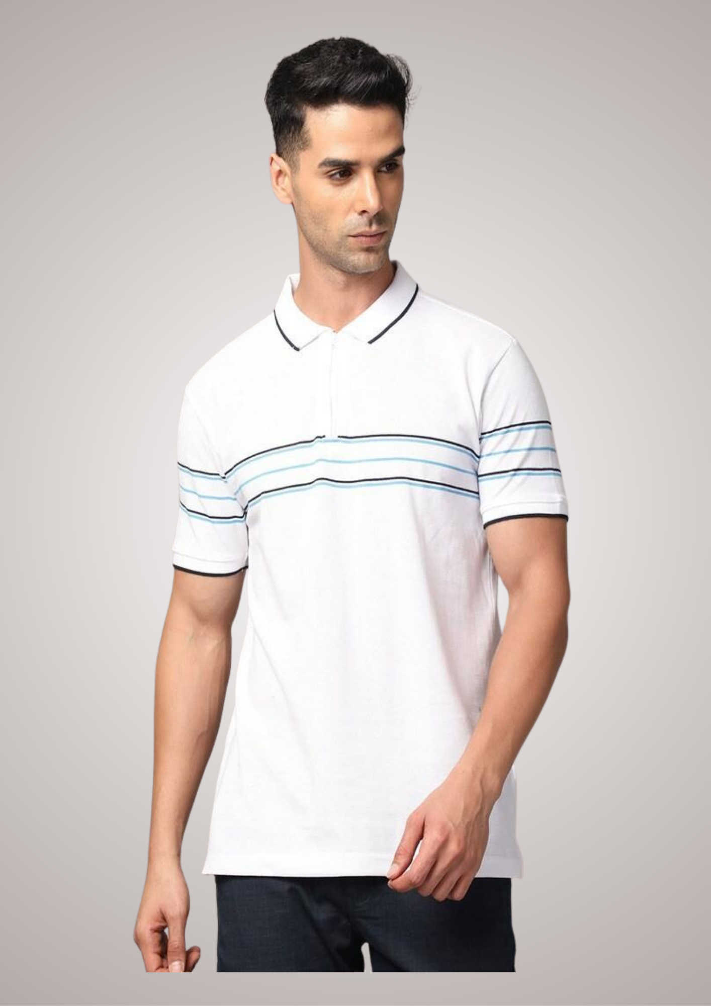 White Cotton Polo T-Shirt for Men with Horizontal Stripe Design (ALTSS24PLO183)
