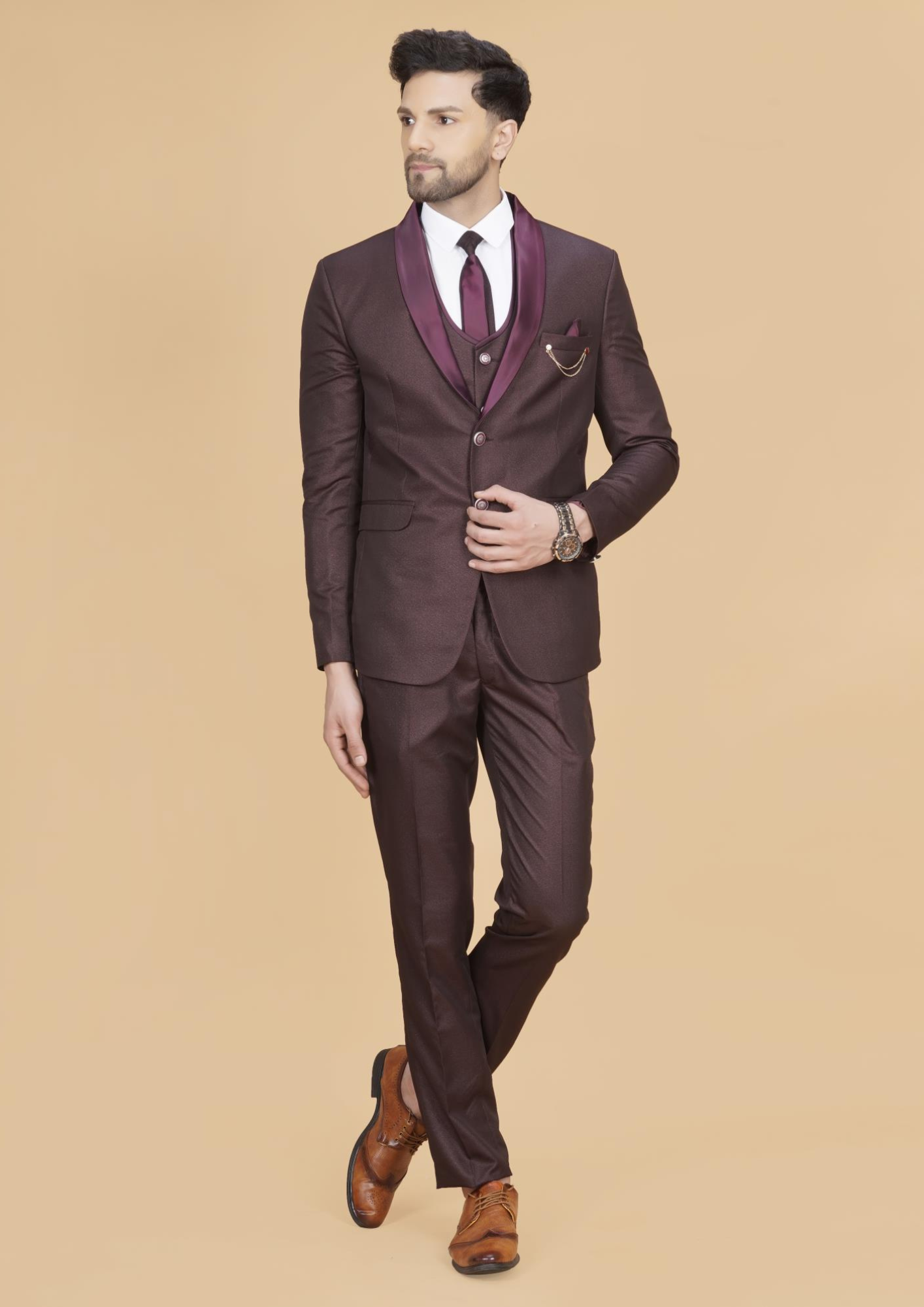 Make an unforgettable impression with this Wine 3-Piece Tuxedo Suit, designed for weddings, receptions, and premium evening occasions. Crafted with fine imported fabric, this suit features a rich wine color blazer with satin shawl lapel, a matching waistcoat, and slim-fit trousers for a polished look.