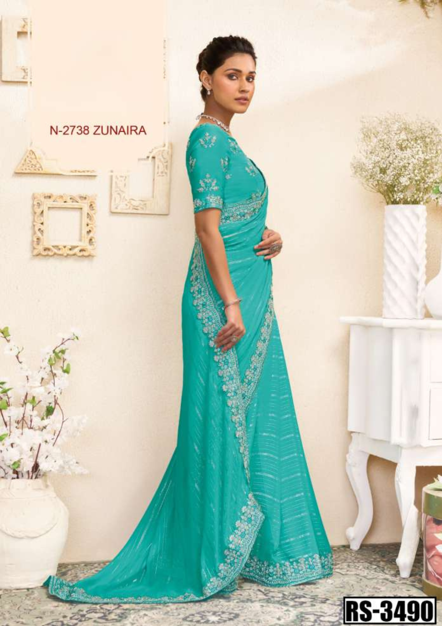 Be the first to review “Zunaira N-2738 Aqua Blue Embroidered Saree – Savitri Collection”